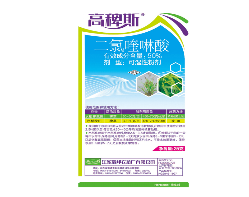 注:①公頃用制劑量=畝用制劑量X15 ②總有效成分量濃度值(毫克/千克)= 制劑含量X1000000)÷制劑稀釋倍數(shù) 1、秧田由于水稻2葉期以前對二氯喹啉酸比較敏感,在秧田中使用應(yīng)在秧苗2.5葉期以后。2、水稻移栽田由于水稻移栽后,當(dāng)稗草2.5-3.5葉期施用。①噴霧法于用藥前一天將田水排干,保持濕潤,用藥后1-2天內(nèi)放水回田,保持3-5厘米水層5-7天,以后恢復(fù)正常管理。3、水稻移栽田使用時(shí),水稻移栽后7-20田均可使用,以特等草2.5-3.5葉期施藥最佳。水稻秧田使用時(shí),避免在水稻播種早期胚根暴露在外時(shí)使用,水稻2.5葉期前勿使用。 |